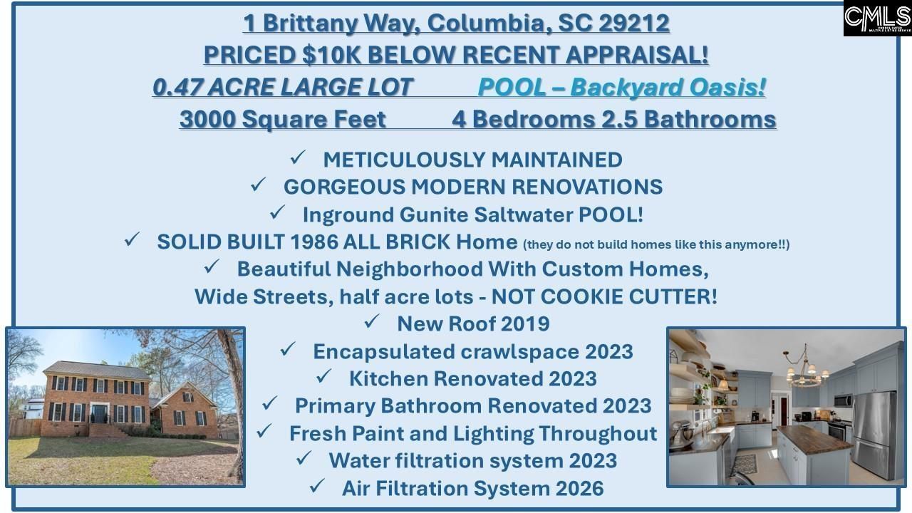 BACKYARD OASIS ALERT!!! This beautifully renovated all-brick home in the desirable Brittany neighborhood features a stunning gunite saltwater pool, nearly half an acre of privacy, and HGTV-style renovations throughout! PRICED $10,000 BELOW RECENT APPRAISAL! 1 Brittany Way, a meticulously maintained 4-bedroom 2.5 bath is located in the award-winning Lexington/Richland 5 School District.Situated on a spacious 0.47-acre lot, featuring beautiful modern updates and timeless character you do not find in newer construction. The 2023 renovated kitchen offers a fresh HGTV-inspired design with warm tones, updated finishes including newer stainless steel appliances, farmhouse sink and a large center island with eat-in kitchen space and LOTS of Storage! The modern lighting flows perfectly into the living and entertaining spaces, making it great to entertain friends and family! The primary ensuite was also fully renovated in 2023, creating a spa-like retreat with large closets and tall tray ceilings. Step into the large sunroom / all-season room, the perfect place to relax year-round while overlooking the fully fenced backyard and your private inground gunite saltwater pool - truly a backyard oasis ideal for entertaining, summer pool days, and quiet evenings at home. This solidly built 1986 all-brick home combines craftsmanship and durability rarely found today, set in a neighborhood known for its custom homes, wide streets, and large half-acre lots - not cookie-cutter living. Additional features include: * Oversized side-entry 2-car garage * New roof (2019) * Encapsulated crawlspace (2023) * Water filtration system (2023) * Air filtration system (2026) * Fresh paint and updated lighting throughout. If you are looking for space, quality construction, modern updates, and a resort-style backyard, 1 Brittany Way is a must-see. See the walk-through video to appreciate the details! Disclaimer: CMLS has not reviewed and, therefore, does not endorse vendors who may appear in listings.