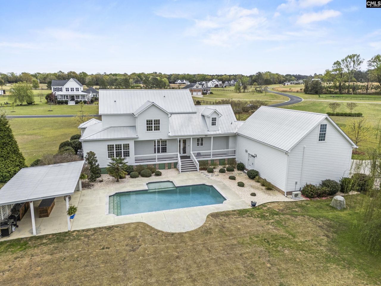 Quintessential Southern charm blends with refined equestrian living! This custom-built estate is set on more than 6 acres within the gated community of Farms of Cottesmore, and includes the main home, 4 stall barn, paddocks, in ground pool, outdoor kitchen and even a small private pond! The home is truly stunning with expansive wraparound porches, 10-foot ceilings and reclaimed heart pine floors throughout the main level. The open-concept kitchen and dining area features granite counters, stainless steel appliances, gas cooktop, and direct access to the pool and cabana. Perfect for entertaining! The main living room is centered by a gas fireplace, with a distinctive mantel sourced from an 1848 Camden residence originally built for Mary Boykin Chesnut, offering a rare connection to the area's rich history. Additional spaces on the main level include a large utility room and a private office with several built in desks. The primary bedroom suite is also downstairs, and provides a peaceful retreat with a walk-in closet, cast-iron clawfoot tub, glass-enclosed shower, and dual Carrara marble vanities. The second level offers 3 spacious guest rooms, each with a private bath, plus an additional room that could be a 5th bedroom, office, or fitness space! An extra hidden feature is the bonus room above the garage for even more flexibility. It is clear the home was originally designed for the builder himself, with custom built-ins around every corner, from the dog suite, shoe and coat cubicles, to the bookshelves! Outdoors, the property is equally impressive with a gunite saltwater pool and 16x28 cabana that create a resort-style setting. The equestrian amenities are top tier and include a beautifully designed barn with four stalls, tack room, washroom with hot water and half bath. Extra features include mats in each stall, rubber pavers in center aisle, and Nelson automatic waterers in each stall. The entire back acreage is fenced for added privacy, and within the fences are 2 smaller paddocks, each with Run-ins, 4 pastures, and a riding arena with all weather footing. This entire estate backs up to renowned Historic Mulberry plantation, for ideal privacy. A true find. D