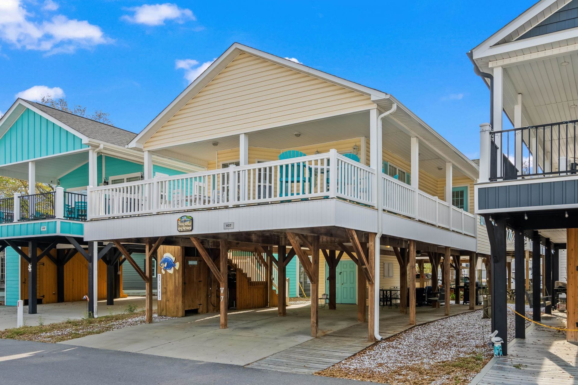 Welcome to V-7 in Ocean Lakes. This 3-bedroom 2 bath raised beach house has plenty of parking under the home along with a nice outdoor entertaining area. Upstairs on the covered deck you have nice composite deck furniture on the large deck. Entering the home is a large living room on the right, dining area and kitchen on the left. Home comes fully furnished including a limo golf cart! Living room has vaulted ceilings with ceiling fan, nice leather furniture and a recliner. Dining area has a 4 seat high top table with open concept kitchen. Down the hall to the right is the main bedroom with King size bed & attached bath. Vaulted ceilings and ceiling fan as well as a door to the deck. Across the hall is bedroom #2 and #3 and full bath #2. Stackable washer and dryer in located in the hall and outdoor shower with hot and cold water is located under the house.