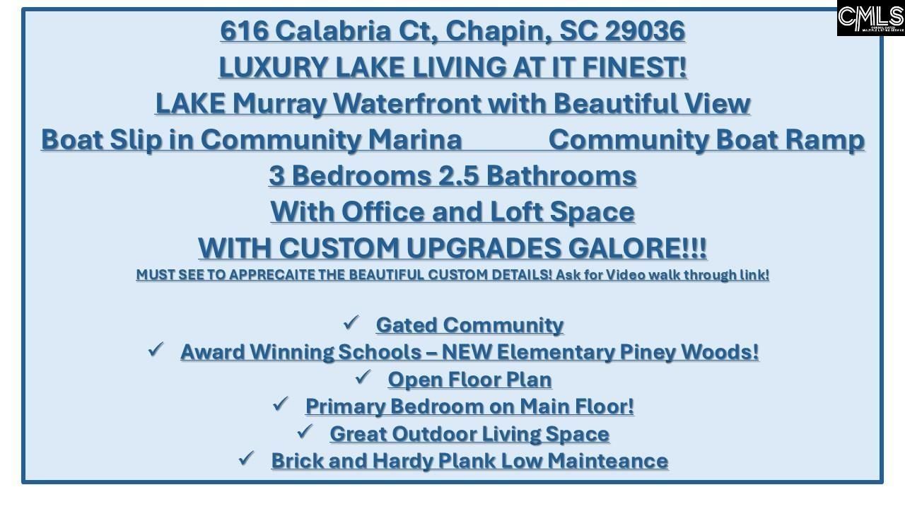 LUXURY LAKE LIVING AT ITS FINEST! Welcome to the breathtaking Lake Murray waterfront home showcasing unmatched views, exceptional craftsmanship, & custom upgrades GALORE. Located in the desirable gated community of Paradise Cove w/ community marina (assigned boat slip #75) + boat ramp, this home delivers premier lake living in the heart of Chapin, just minutes from Timberlake Golf Club (an Equity Stake in Timberlake Country Club Negotiable with sale). This thoughtfully designed home features 3 bedrooms, 2.5 bathrooms, a dedicated office, and a spacious loft, offering flexibility for today's lifestyle. The open floor plan is enhanced with striking architectural details and high-end finishes, while the primary bedroom on the main floor provides ideal convenience and privacy with a lake view. Outdoor living is exceptional with a screened porch featuring a gas log fireplace and custom swing, an oversized deck with stunning lake view (recently refinished), a recessed hot tub with privacy shades, a gas line for the deck grill, and a fully aluminum-fenced backyard with gated lake access. The interior is loaded with high-end upgrades, including all soft-close cabinets, comfort-height countertops and toilets, a kitchen hood vented to the outside, under-cabinet lighting, and a built-in Surround Sound speaker system. All TV locations are wired for cable, power, and Ethernet, with surround sound ready. Additional features include smart thermostats, luxury vinyl plank flooring throughout, a wood staircase with metal spindle accents, ceiling fans in all rooms, sound insulation between floors, heavy custom molding, recessed lighting, laundry cabinets with hanging bars, a pet house under the stairs, and walk-in attic storage. To appreciate, see the Walkthrough video, ask for the link and All Inspections in DOCS! Disclaimer: CMLS has not reviewed and, therefore, does not endorse vendors who may appear in listings.